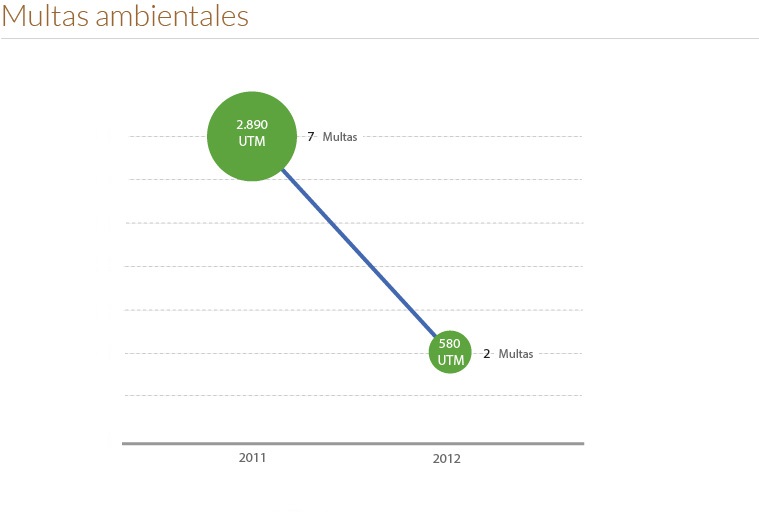 EN28 En 2012 pagamos dos multas asociadas a incumplimiento de la normativa ambiental en materia de gestión de residuos sólidos y descargas líquidas, por un valor monetario total de 580 UTM1. De esta manera, disminuimos considerablemente el número de multas en consideración a las 7 presentadas en 2011, así como el monto cancelado que bajó en un 80%. Por su parte, Minera Gaby SpA no presentó multas de este tipo.